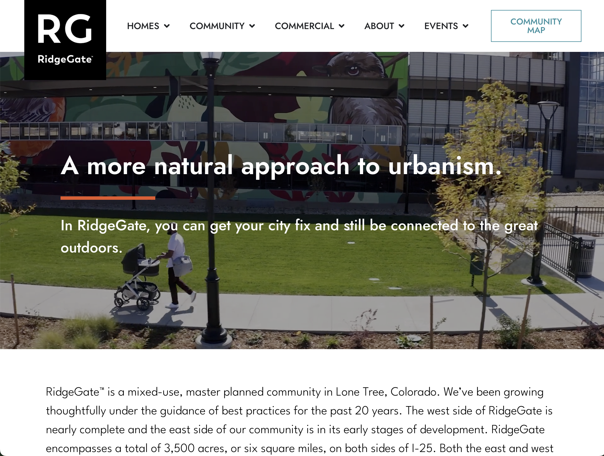 RidgeGate is a new urbanism community in Lone Tree that blends urban amenities with natural beauty.